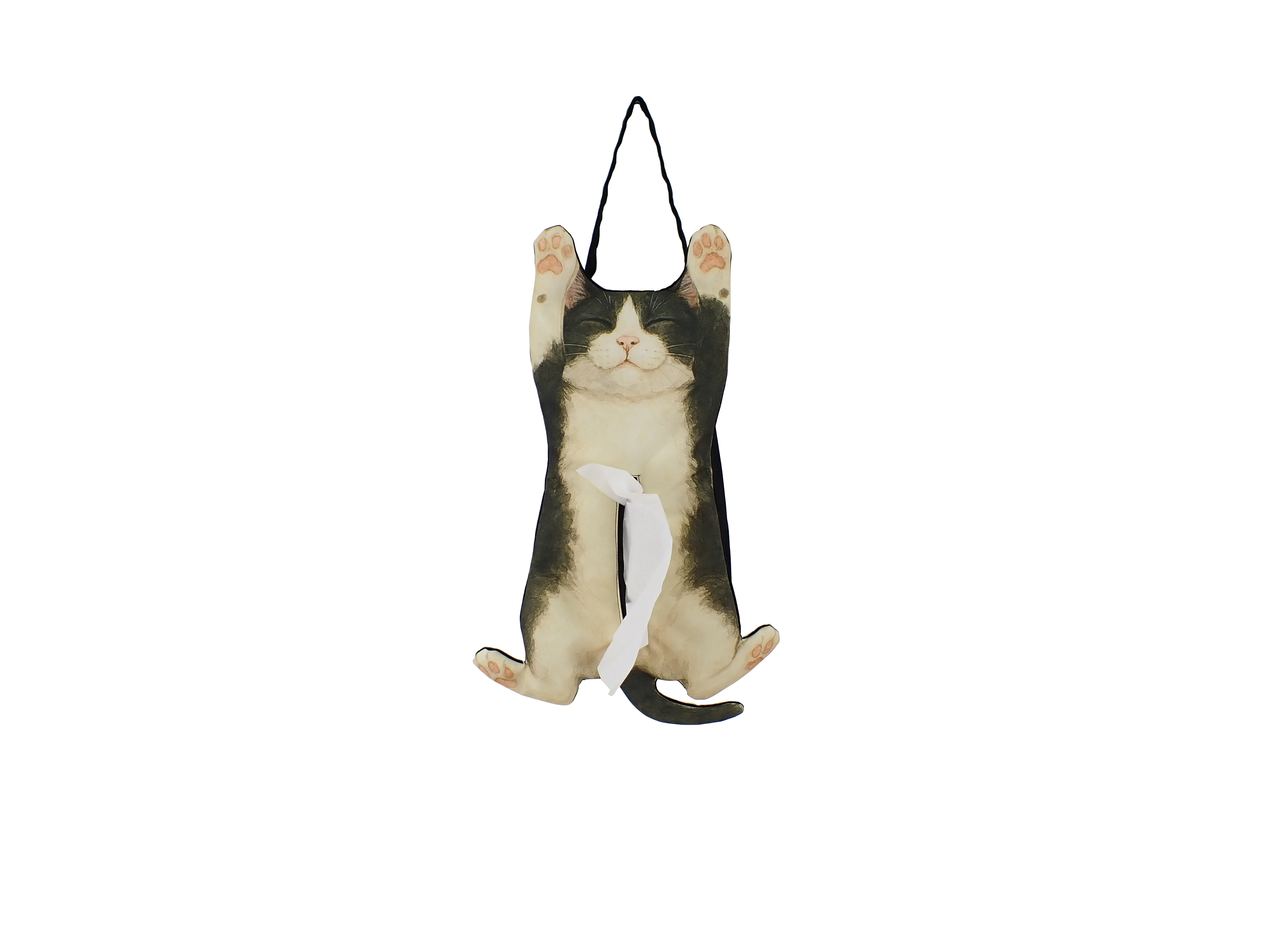 ねこが寝っ転がったデザインのティッシュボックスカバー。リビングやお部屋、車でもほっことした雰囲気を与えてくれます。
